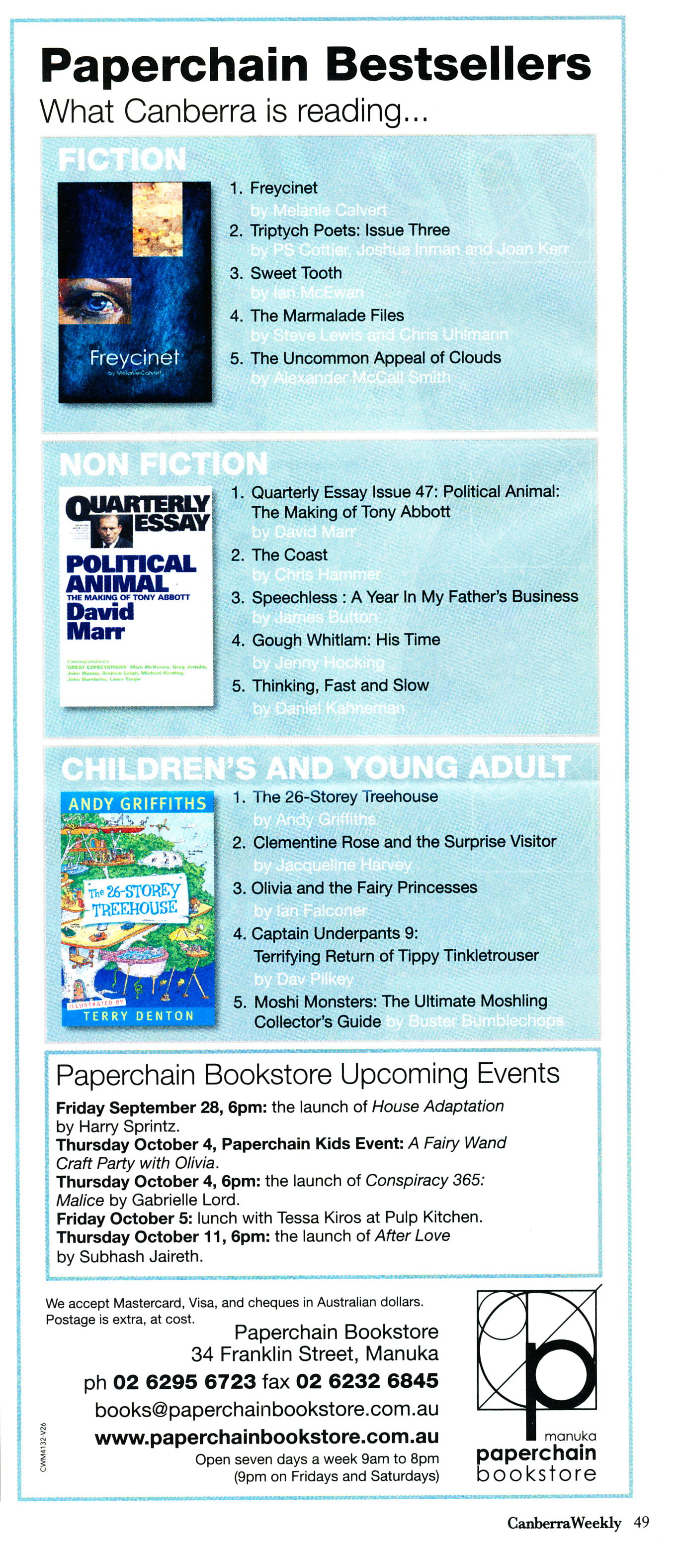 Freycinet Number 1 at Paperchain! Posted on October 19, 2012 by Melanie Calvert So I return from two weeks away from work (for school holidays) to find on my desk a clipping on which my book is pictured at Number 1! Very, very exciting and lovely. Share this: Click to share on LinkedIn (Opens in new window) LinkedIn Click to share on Pinterest (Opens in new window) Pinterest Click to share on Facebook (Opens in new window) Facebook Click to email a link to a friend (Opens in new window) Email Like Loading... Related